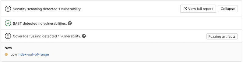 After a vulnerability is found, you can address it. The merge request widget lists the vulnerability and contains a button for downloading the fuzzing artifacts. By clicking one of the detected vulnerabilities, you can see its details.