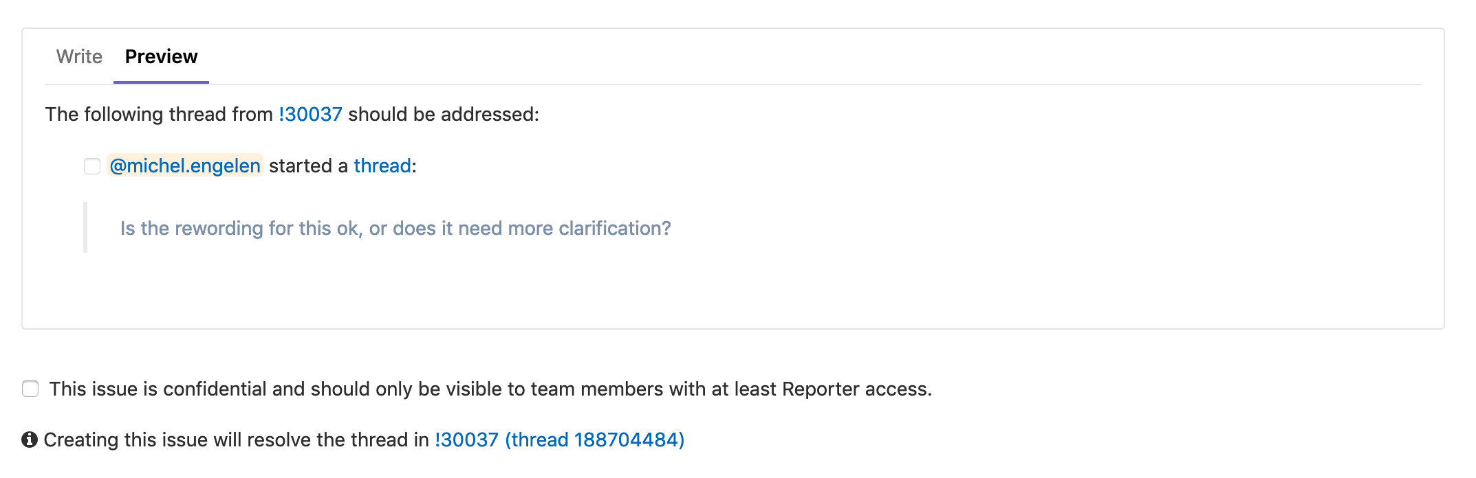This directs you to a new issue prefilled with the content of the thread, similar to the issues created for delegating multiple threads at once. Saving the issue marks the thread as resolved and add a note to the merge request thread referencing the new issue.