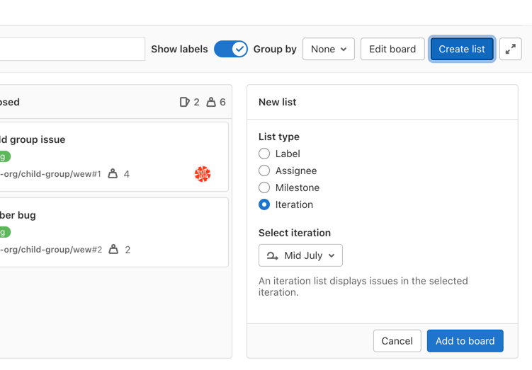 - Add multiple issues to lists in the board by selecting one or more existing issues.