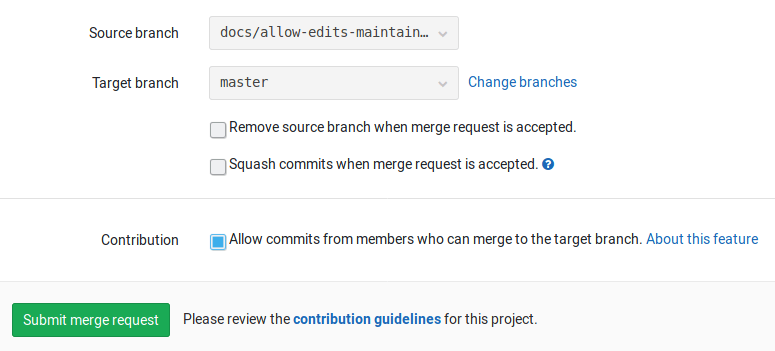 1. While creating or editing a merge request, select the checkbox Allow commits from members who can merge to the target branch.